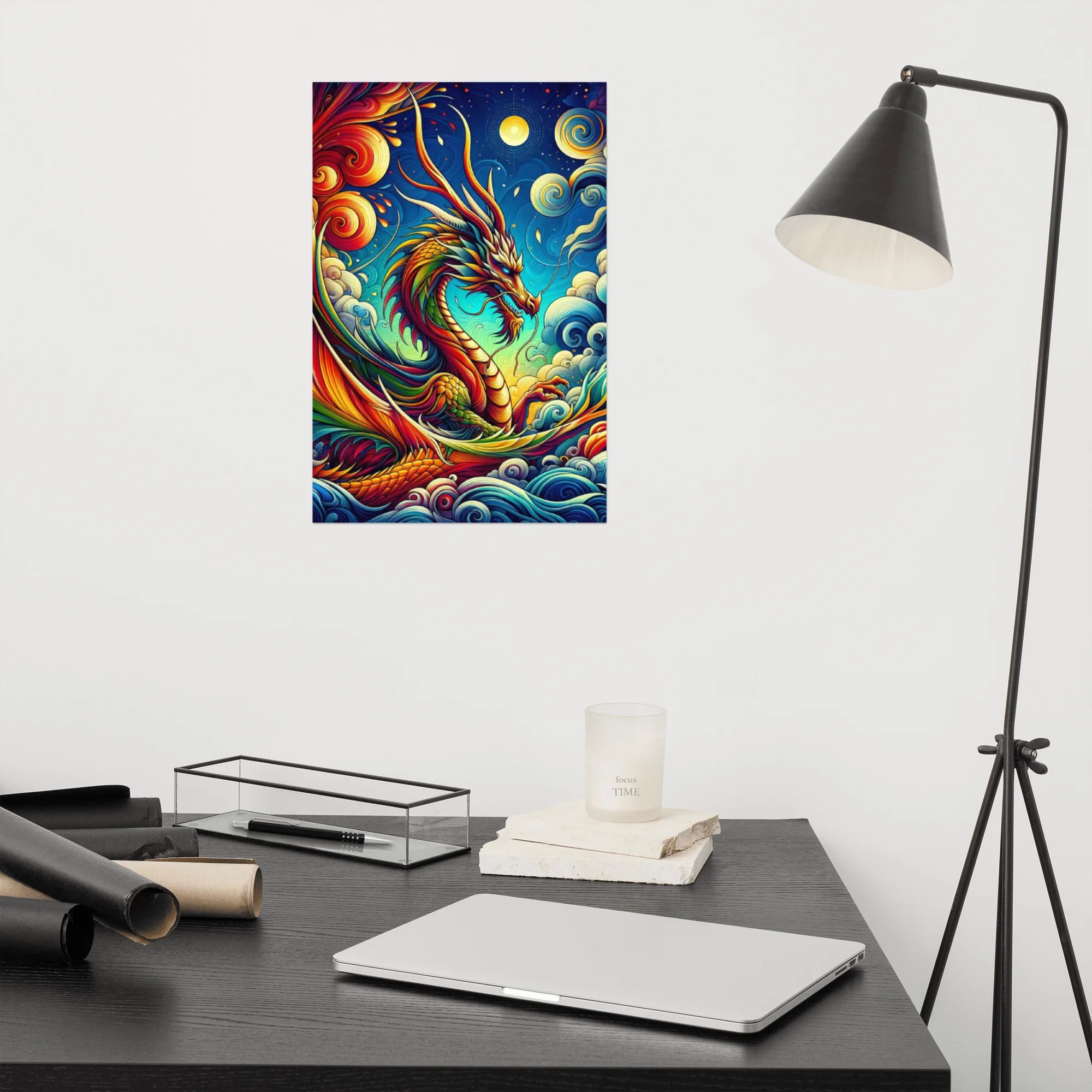 Embark on a celestial journey with “Celestial Dance: The Mythical Dragon’s Voyage,” a digital art poster that captures the essence of myth and cosmos in one. 🐉✨ This stunning piece features a dragon, crafted with intricate linework and a spectrum of saturated colors that bring its powerful grace to life. The creature soars through a cosmic sea, with fiery swirls and cool astral bodies forming a backdrop that is both mesmerizing and full of ancient mystery.