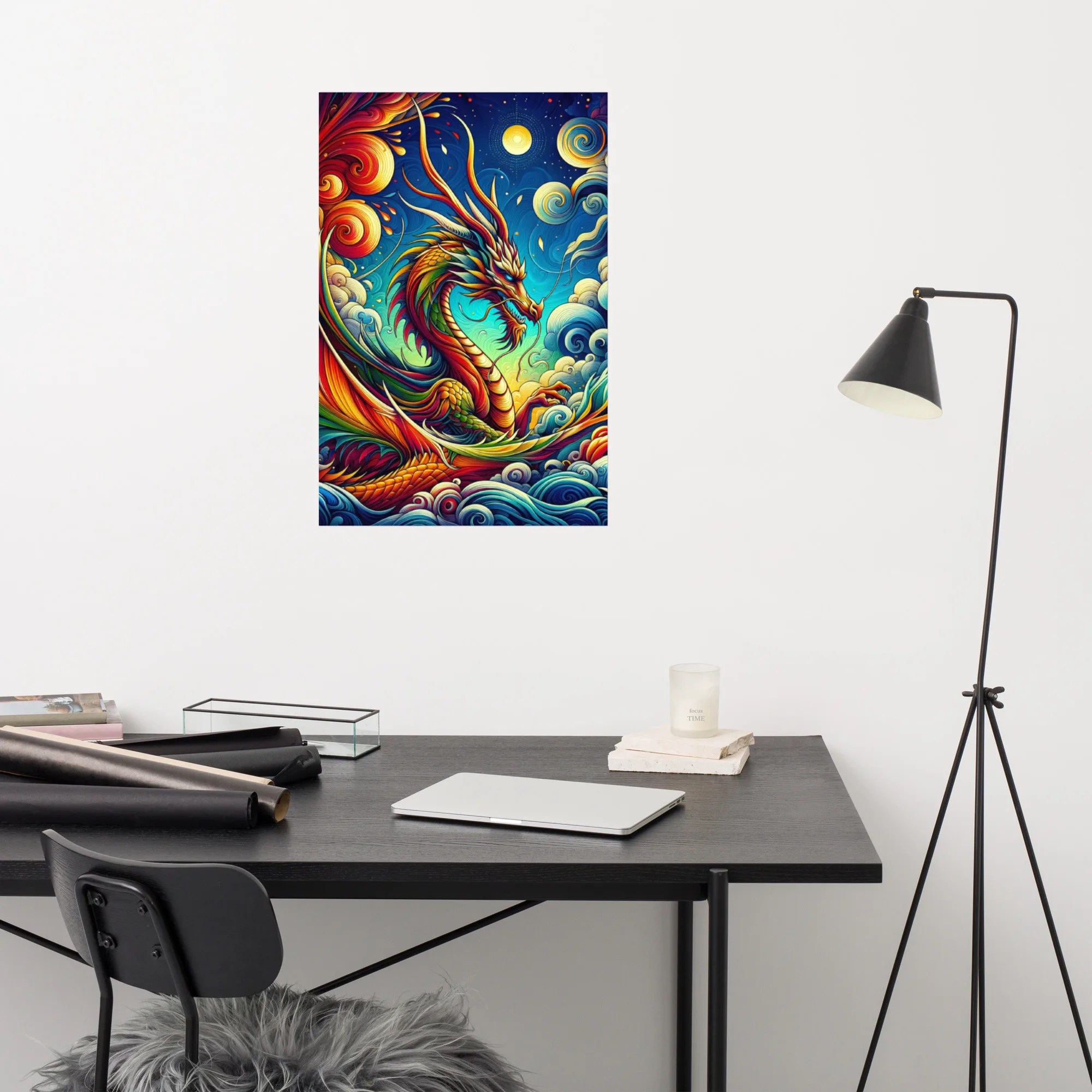 This artwork represents the fusion of fantasy and tradition, a celebration of the dragon’s enduring legacy in a dance across the starry heavens.